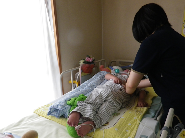 わかばでは、数週間から数ヶ月の期間にて集中的なリハビリテーションや手術及び術後のリハビリテーションのために入院をされています。立つことや座ることなどの日常生活において必要な機能の獲得や改善を行っています。写真は立つことにより下肢の支持性を高め、体幹や股関節をしっかり伸ばすことにより、頭を上げながら手を使って絵本などであそんでいる場面です。